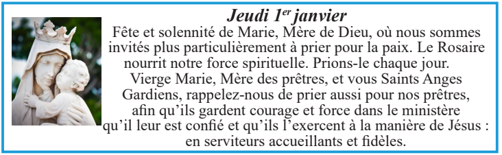 30 décembre 2025 Jeudi 1er janvier : Solennité de Marie, Mère de Dieu Messes : 9h30, en l’église de Causses et Veyran 10h30, en l’église de Saint Alexandre de Bédarieux, de Notre Dame de Nize et de Puissalicon